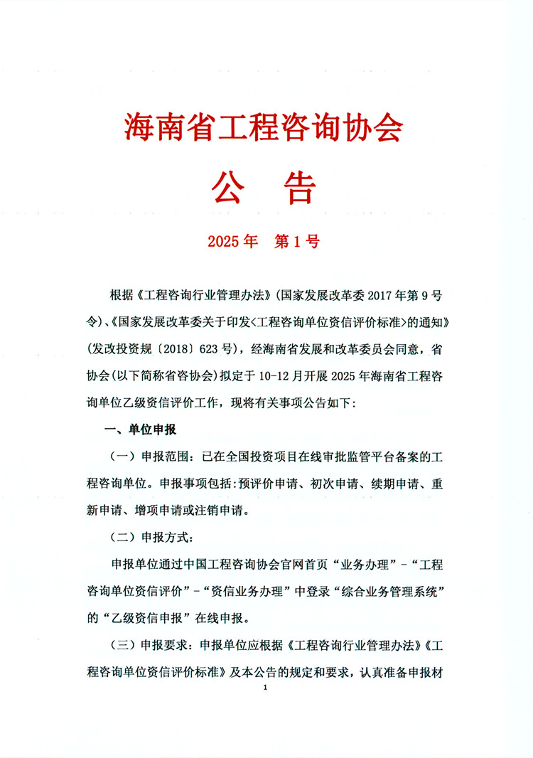 海南省工程咨询协会2025年第1号公告 您所在位置:网站首页 > 详细信息