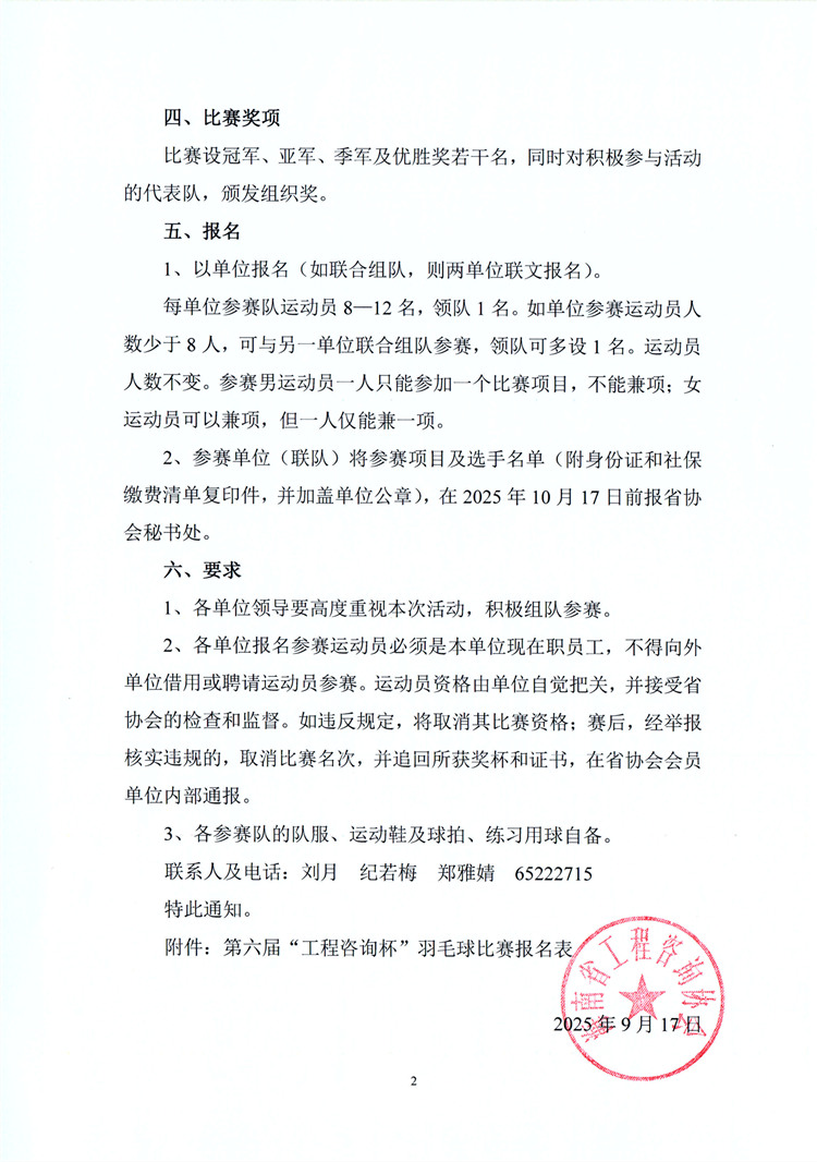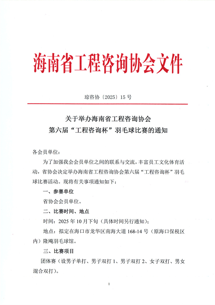 关于举办海南省工程咨询协会第六届“工程咨询杯”羽毛球比赛的通知 您所在位置:网站首页 > 详细信息