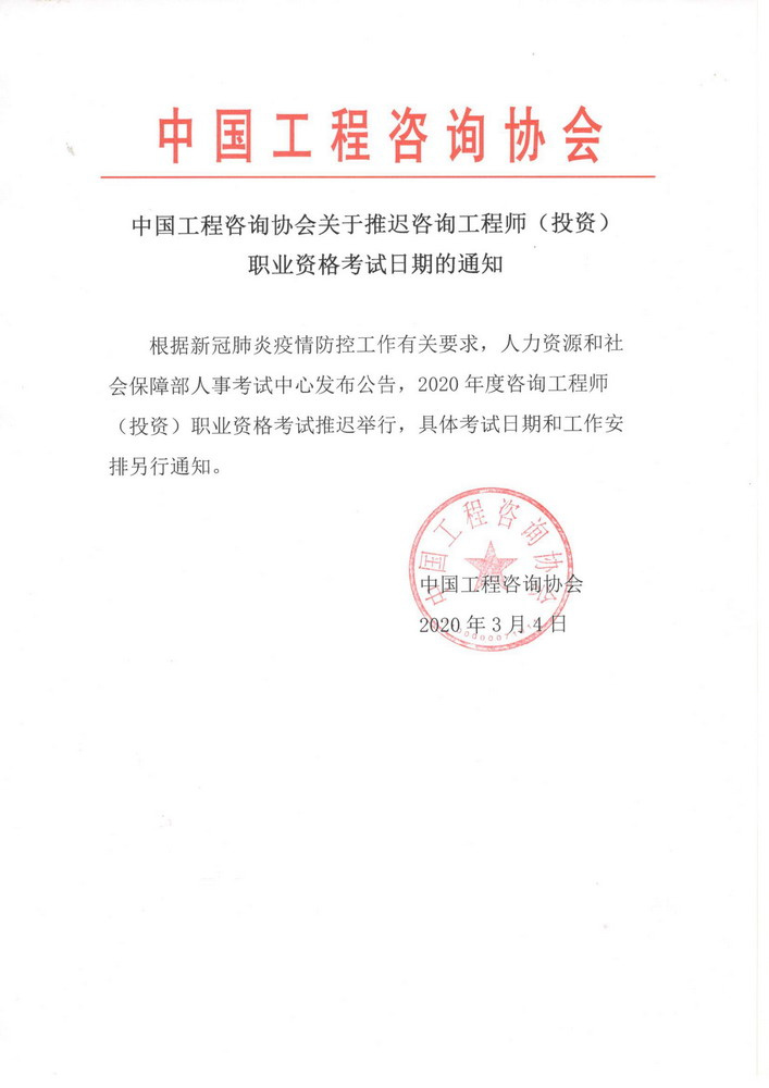 中国工程咨询协会关于推迟咨询工程师(投资)职业资格考试日期的通知 您所在位置:网站首页 > 详细信息