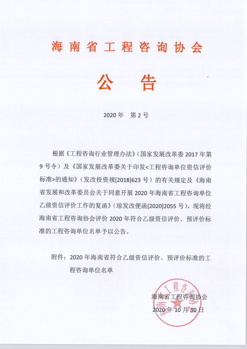 海南省工程咨询协会公告2020年第2号 您所在位置:网站首页 > 详细信息