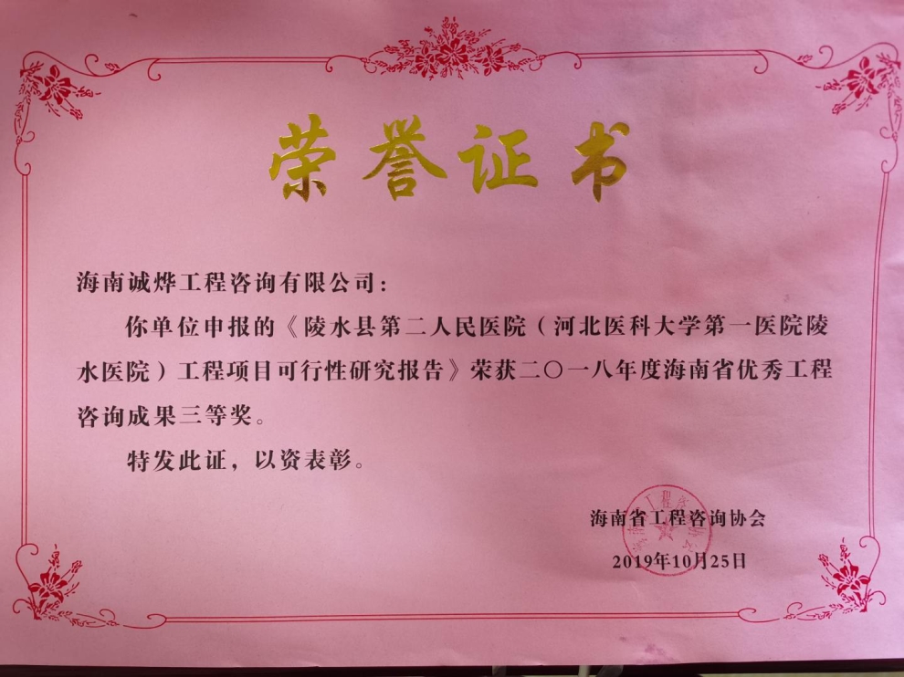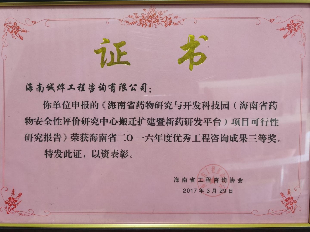 公司主要业务范围包括项目的策划咨询;编审项目建议书及可行性研究报告、项目申请报告和资金申请报告;编制规划咨询、节能评估;施工组织设计、技术咨询等项目咨询服务。自成立以来业务在不断扩大和发展,承担了许多政府和企业委托的工程咨询项目,成果均得到委托方的好评。在2016年及2018年度海南省优秀工程咨询成果奖项目评比中,我司申报的《海南省药物研究与开发科技园(海南省药物安全性评价中心搬迁扩建暨新药研发平台)项目可行性研究报告》、《陵水县第二人民医院(河北医科大学第一医院陵水医院)工程项目可行性研究报告》均荣获三等奖。