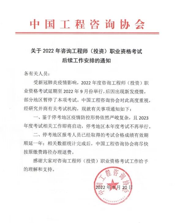 关于转发中咨协会《关于2022年咨询工程师(投资)职业资格考试后续工作安排的通知》 您所在位置:网站首页 > 详细信息