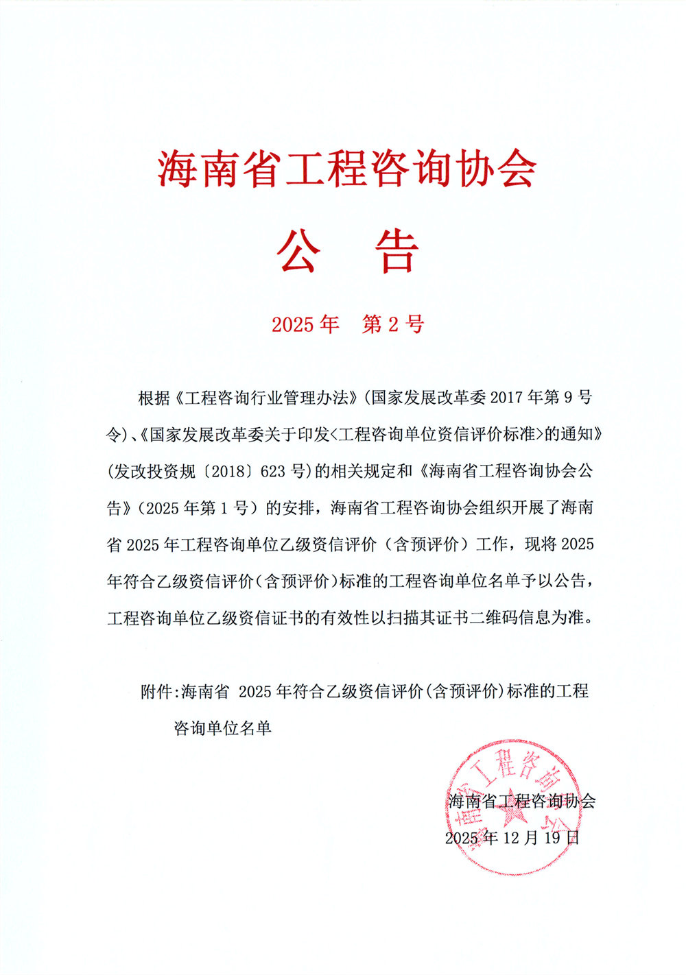 海南省工程咨询协会公告2025年第2号 您所在位置:网站首页 > 详细信息
